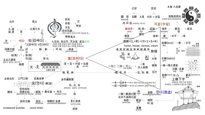 페이지를 되돌려 ‘집의 어원을 찾아가는 로드맵’을 살펴보자. 시대가 변하고 장소가 달라져도 형태는 다를지라도 집에 대한 인류의 공통 의식은 존재하리라 생각한다. 집의 어원을 ‘짓다’, ‘지붕’, ‘집(集)’ → 함께 모여 살기 위해 지붕(경계)을 짓는다. 이 세 개의 단어를 중심어 포석으로 삼아, 덧붙여 설명해 주는 단어(用)를 주변에 포진시켜 그루핑(grouping) 한다. 하지만 덧붙여 설명하는 단어(키워드)가 한 중심어에만 국한하는 것은 아니다.