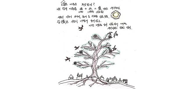 앞서 말한 집의 어원을 ‘모이다’, ‘지붕(경계)’, ‘짓다’라고 한다면 이 세 가지를 아우르는 단어를 ‘집(集:모이다)’이라고 필자는 생각한다. 사람이 어떻게 모일 것이냐는 질문은 사람과의 관계를 의미하기도 하고 ‘주변 자연환경을 어떻게 받아들이고 혹은 어떻게 경계를 지울 것인가? 그래서 집을 짓는 재료를 어떻게 모을 것인가?’로 정의 내릴 수 있을 것이다.