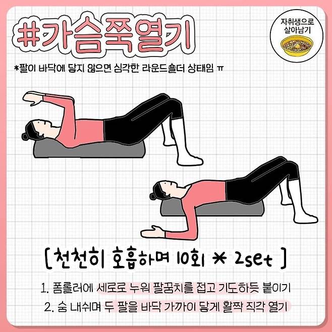 팔을 머리 뒤로 넘기거나, 팔짱을 끼고 날개뼈가 벌어지게 만듦