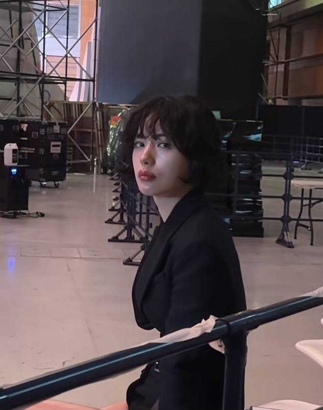 나나는 블랙 테일러드 재킷을 숏 점프수트 형태로 재해석한 슈트 스타일링으로 등장해 시선을 압도했습니다.