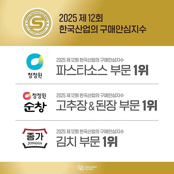 [이포커스] 대상㈜이 (사)한국마케팅협회와 ㈜소비자평가가 주관하는 ‘2025 제12회 한국산업의 구매안심지수(KPEI)’ 김치, 고추장, 된장, 파스타소스 4개 부문에서 1위를 차지했다고 21일 밝혔다.