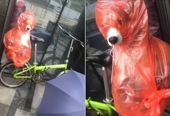 할아버지 나름대로 강아지를 위한 비닐 우비를 만들어준 것입니다. 행여 빗물이 들어가지는 않을까 싶어서 코만 빼놓고 비닐봉지로 꽁꽁 싸맨 할아버지.