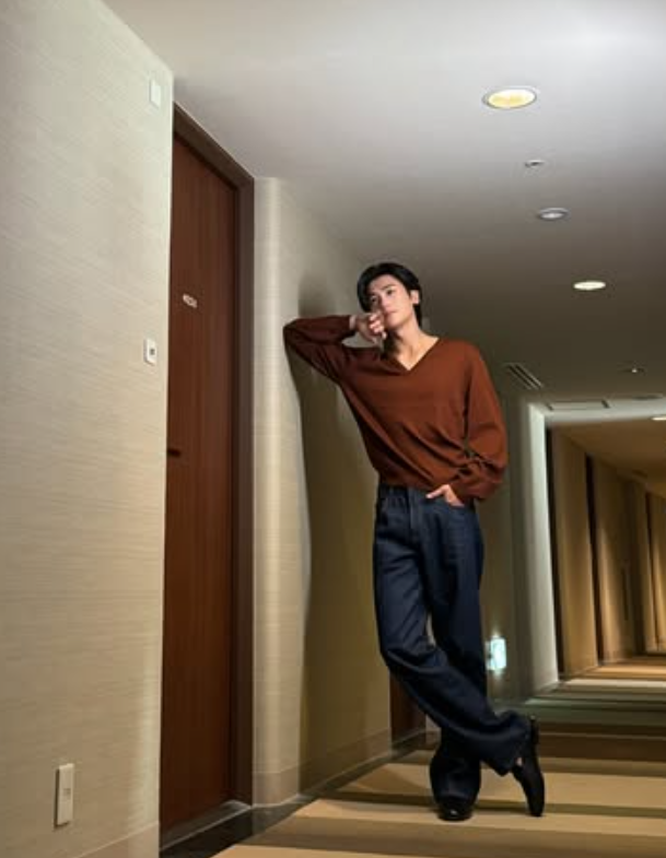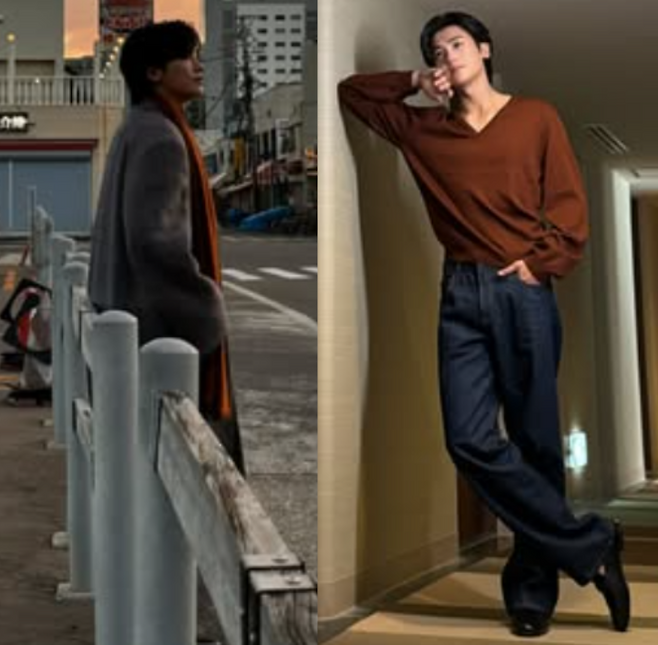 또 다른 스타일로는 브이넥 와인색 카디건을 선택해 차분하면서도 고급스러운 무드를 연출했어요. 깊이감 있는 와인 컬러가 그의 세련된 분위기를 한층 강조했는데요. 여기에 진한 컬러의 데님팬츠로 깔끔한 남친룩을 완성했어요.