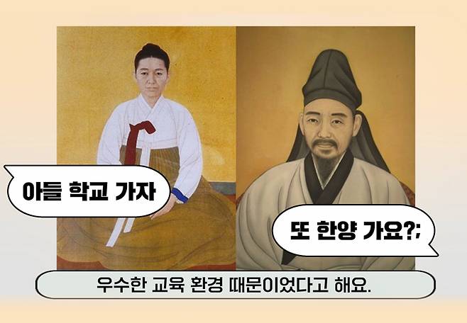 또 다른 예로는 우리가 잘 알고 있는 다산 정약용 선생님이 유배지에서 자식들에게 보낸 편지 내용 중에 ‘너네는 한양을 벗어나지 마라’라고 하며 지금 말로 ‘인 한양’을 강조한 게 있다고 해요. 그리고 율곡 이이의 어머니인 신사임당이 자식을 데리고 강릉-서울을 오간 것도 사학을 갖춘 한양의 우수한 교육 환경 때문이었다고 해요. 교통도 안 좋고, 얼마나 힘들었겠어요. 그래도 자식 교육 때문에 강릉에서 서울까지 왔다 갔다 한 거죠.