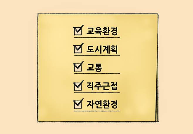 ☑ 교육환경 ☑ 도시계획 ☑ 교통 ☑ 직주근접 ☑ 자연환경