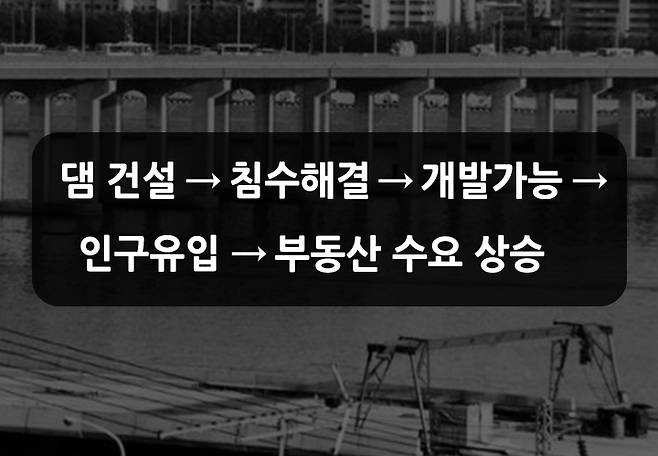 당시엔 강북과 강남을 오가려면 나룻배를 타고 다녀야 할 정도로 소외된 곳이었지만, 댐을 건설해서 침수가 해결되면 다리도 놓고, 집과 학교도 지으면 자연스럽게 인구가 늘어날 거라고 생각한 겁니다. 인구가 늘면 부동산 가격이 오르는 건 당연한 거죠. 게다가 정부의 주도하에 도시계획이 이뤄진다면 부동산 투자에 있어서 엄청난 호재라고 생각한 겁니다. 그런데 무려 60년 전에 정주영이 강남 땅값 상승을 예측할 수 있었던 것은 현재 부동산 투자에서도 똑같이 적용됩니다.