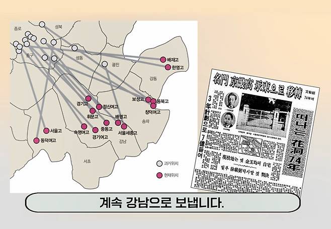 1970년대에도 마찬가지예요. 1970년대 강남 개발 당시, 서울의 중심지는 강북이었습니다. ‘명문고’는 광화문 일대에 모여 있었고 상업의 중심지는 명동이었습니다. 정부는 의욕적으로 강남을 개발했지만 당시 강북의 사람들은 어지간해서는 강남으로 이주하지 않았죠. 이때 600년 전과 비슷한 장면이 다시 펼쳐집니다.