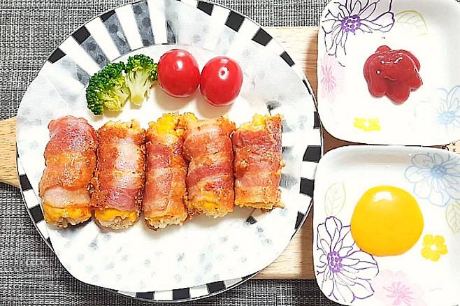 찬밥의 맛있는 변신 베이컨치즈 주먹밥 완성입니다. 그냥 드셔도 맛있지만 케첩과 머스터드 소스 찍어도 맛있습니다.