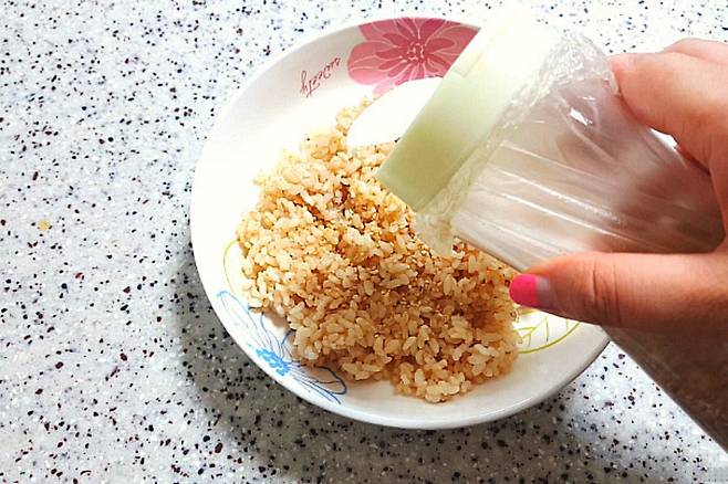 찬밥을 살짝 데워서 참기름과 깨를 약간 넣어 버물버물 해줍니다. 베이컨과 치즈가 짭조름하니까 소금은 따로 넣지 않으셔도 됩니다.