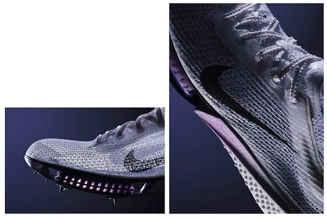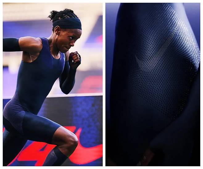 먼저, 페이스 키프예곤이 입은 플라이수트. 겉보기엔 유니폼처럼 보이지만, 사실은 바람을 상대하기 위해 만들어진 무기예요. 달리기에서 가장 큰 방해 요소는 바로 공기 저항인데, 이 수트는 그걸 최대한 줄이기 위해 설계됐죠. 공기의 저항을 가장 많이 받는 표면 곳곳에 붙어 있는 작고 둥근 반구형의 돌기 ‘에어로노드’는 몸에 닿는 공기를 더 부드럽게 흘러가게 하고, 뒤쪽으로는 작은 소용돌이를 만들어서 공기가 맴돌지 않게 해요. 이런 디테일 덕분에 같은 속도로 달려도 덜 힘들고 더 빠르게 앞으로 나아갈 수 있는 거죠. 이런 정교한 설계 하나하나가 1초를 다투는 경기에서 결정적인 차이를 만들어내죠. 과학을 옷처럼 입고 달렸다고 해도 과언이 아니에요.