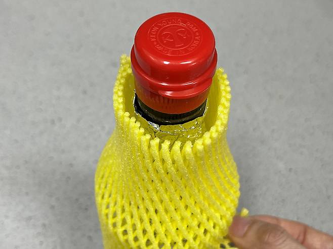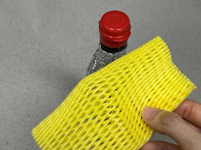 기름병은 아무래도 사용하는 과정에서 기름이 흐르면서 미끌거리기 쉽습니다. 이럴 때 과일망을 끼워주면 훨씬 안전하게 사용할 수 있습니다.