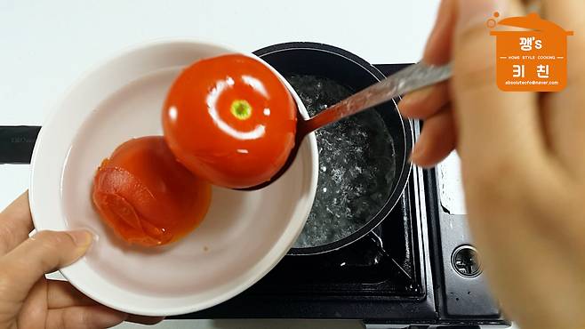 4. 끓는물에 토마토 넣어 살짝 데치기