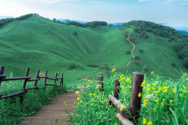 민둥산은 바다에서 퇴적된 석회암으로 이루어져 있고, 암석이 녹으면 표면이 웅덩이처럼 들어가는 특징이 있어요. 이를 돌리네라고 부르며, 대표적인 카르스트 지형의 특징을 보여줍니다.
