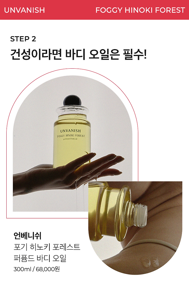 샤워가 끝난 후 피부의 수분이 밖으로 빠져나가기 전에 최대한 빠르게 보습제를 발라주는 것이 중요한데요. 물기를 닦지 않은 상태에서 바디 오일을 발라주면 보습막을 만들어주어 건조할 틈이 없죠. 언베니쉬의 퍼퓸드 바디 오일은 끈적임 없는 매끈한 발림성으로 피부에 닿는 순간 촉촉하게 흡수되는데요. 타월로 남은 물기를 톡톡 닦아내 주면 흡수를 기다릴 필요 없이 깔끔하게 마무리되죠. 부담 없는 가벼운 텍스처임에도 진한 보습감을 선사해 주어 샤워 직후에 사용해 주기 좋아요. 비에 젖은 숲의 히노끼 향기까지 더해져 지친 마음까지 편안하게 감싸주는 기분까지 느낄 수 있어요.