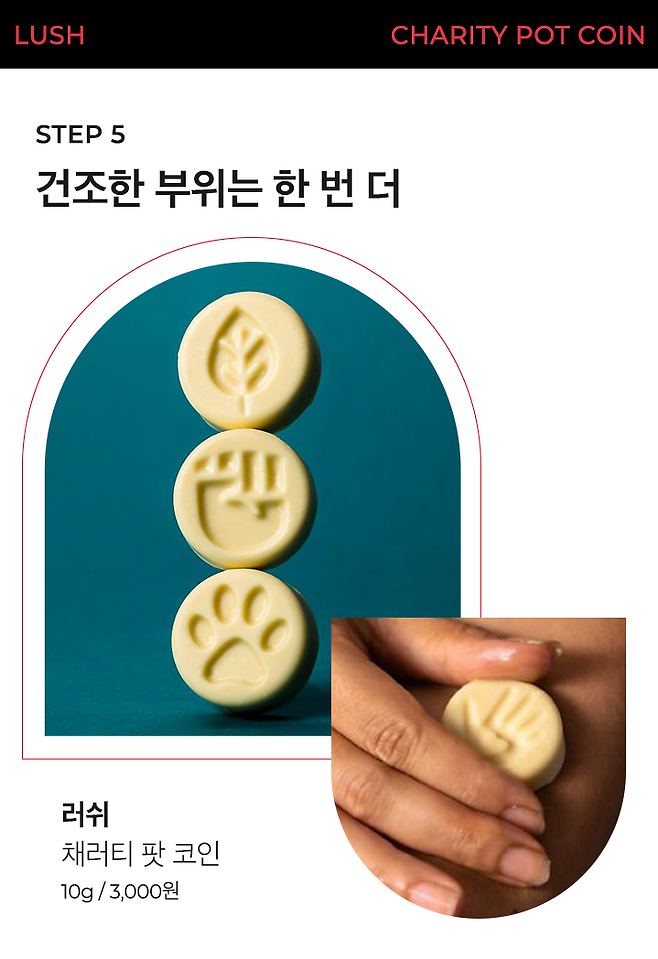 겨울만 되면 발뒤꿈치가 갈라지고 팔꿈치가 하얗게 일어난다면 마지막 단계에 고체형 로션을 덧발라주는 것을 추천해요. 러쉬의 채러티 팟 코인은 코코아 버터와 쉐어버터, 식물성 오일 등의 성분이 함유되어 묵직한 보습감을 더해주는데요. 보습을 더해주고 싶은 부위에 제품을 문질러주면 체온에 녹은 제형이 피부에 촉촉하게 흡수되면서 보습은 물론 각질까지 부드럽게 잠재워주죠.