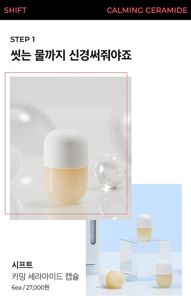 건조하고 예민한 피부일수록 먼저 생각해야 하는 건 바로 몸에 닿는 물! 시프트의 카밍 세라마이드 캡슐은 고농축 세라마이드와 알로에베라, 코코넛 오일 등의 보습 성분이 함유되어 있는 샤워기 내장 캡슐인데요. 샤워기를 틀어 놓음과 동시에 가렵고 건조한 피부를 빠르게 보습해 주고 진정시켜줘요. 고농축의 비타민C 성분은 수질을 깨끗하게 정화해 주고 피부를 맑게 케어해주죠. 강한 향 없이 보습, 진정과 장벽 강화에 집중한 성분으로 아토피나 접촉성 피부염이 있는 민감한 피부도 걱정 없이 사용할 수 있어요.