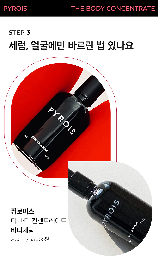 바디 오일로 수분이 날아가지 않게 잡아준 후엔 바디 세럼을 발라 피부 결을 케어해줘요. 퓌로이스의 더 바디 컨센트레이트는 마치 얼굴에 발라도 될 듯한 가벼운 텍스처와 빠른 흡수력, 산뜻한 마무리감이 특징인데요. 당김 없이 오래도록 보습감이 유지되어서 사계절 내내 사용하기도 좋아요. 보습에 효과적인 히알루론산과 세라마이드 그리고 미백 주름 기능성 성분이 조합된 제품으로 바디 안티에이징까지 가능한 제품!
