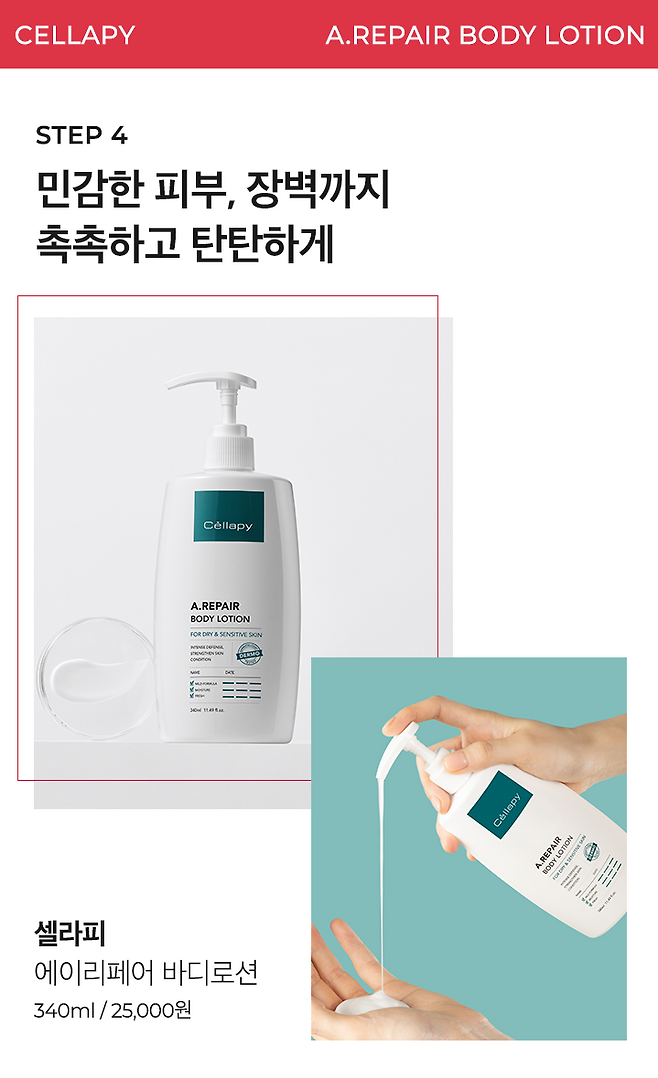 밀키한 크림 제형의 셀라피 에이리페어 크림 바디워시와 에이리페어 바디로션을 함께 사용해 주면 샤워 후에도 당김 없이 더욱 강력한 보습, 진정 효과를 확인할 수 있어요!