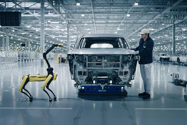 차체 공정의 마지막 단계인 외관 품질 검사에서는 보스턴다이나믹스의 4족 보행 로봇 ‘스팟(Spot)’이 수행하는 사양 검사와 측정된 품질 정보를 조립 로봇으로 실시간 피드백 보내 고품질 생산을 가능토록 지원하는 간격/단차 검사가 이뤄진다.