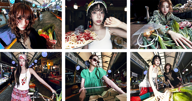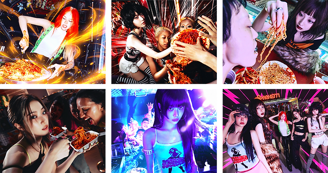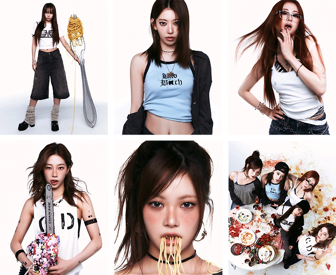 마지막으로 COMPACT BITES👄 버전에서는 프로필 사진 무드의 콘셉트 포토가 펼쳐집니다! 비현실적인 크기의 포크나, 아기자기한 파츠로 꾸며진 전기톱 등의 소품이 특히 눈에 띄는데요. 이는 어딘가 위험하면서도 귀여운 느낌을 전달하는 듯합니다. 또한 짙은 메이크업과 멤버별로 제작된 ‘그릴즈’💎 아이템은 힙하면서도 불량한 무드를 보여 줍니다. 단체 컷에서는 마치 사건 현장처럼 스파게티가 지저분하게 널부러져 있는 연출이 드러나는데요. 이러한 요소들에서는 강렬한 날것의 이미지를 드러내려는 시도가 엿보입니다. 마치 ‘정돈되지 않은 모습까지 사랑받기 충분하다’는 메시지를 전달하려는 듯하네요!