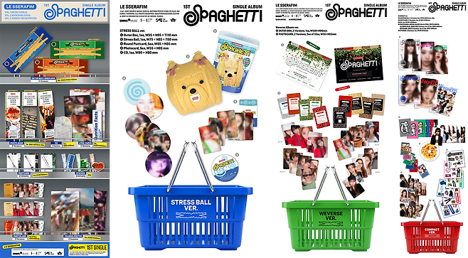 [SPAGHETTI]의 이번 피지컬 앨범💿은 특히 주목할 만한 포인트가 됩니다! 콘셉트를 잘 드러낸 독특한 아웃박스가 이목을 끄는데요. 일반반인 SPAGHETTI ver.에서는 아웃박스를 ‘스파게티 면’처럼 디자인한 것을 확인할 수 있습니다. 마트 매대에 놓여 있어도 손색이 없을 정도죠.🛒 즉석 식품처럼 디자인된 STRESS BALL ver.은 최근 유행 중인 ‘스트레스 볼’ 굿즈를 접목시켜 많은 팬들의 소장 욕구💸를 불러일으키기도 했습니다. 또한 Weverse ver.은 조미료의 모습을 빌려온 것으로 보이는데, 구성품인 포토카드를 파슬리, 바질, 블랙페퍼 등으로 디자인한 것이 인상적이네요! 마지막으로 COMPACT ver.입니다. 앨범 표지에 멤버들의 초상을 담은 첫 번째 앨범이라는 점이 의미 있게 느껴지는데요. 앨범 CD를 스파게티가 플레이팅된 접시의 모양처럼 구성한 것이 또 한 가지의 포인트로 작용하네요. ‘스파게티’🍝라는 중심 콘셉트에 충실하여 다채로운 매력을 가진 피지컬 앨범이 탄생할 수 있었던 듯합니다!
