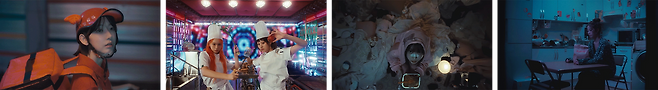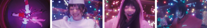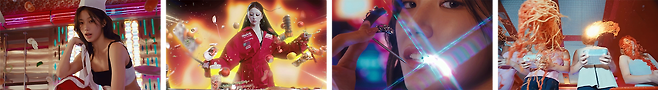 또한 뮤비에서는 다양한 CG 효과를 감상할 수 있었습니다. 수시로 폭발하는 공간과 식재료가 떠다니는 장면들은 마치 B급 영화 같은 무드의 익살스러움을 연출하는데요. 더하여 밝고 유쾌한 표정의 활용으로 자유롭고 당찬 이미지를 형성하고, 네온 등 화려한 조명 연출이 가미되면서 전반적으로 화려한 영상의 무드를 만들어 냅니다. 이는 “내가 이상하고 웃긴 행동을 해도 멋져 보일걸?” 하는 자신만만한 애티튜드로 느껴지는 듯하네요! 후반부에는 사람들의 얼굴이 붉은 스파게티로 폭발💥하거나, 토마토 주스가 두상에 흩뿌려지는 장면들이 이어지며, 시각적인 자극이 몰아칩니다. 유쾌함 속에 담긴 근거 있는 자신감, 르세라핌의 매력을 명확히 확인할 수 있었던 뮤직비디오였습니다!