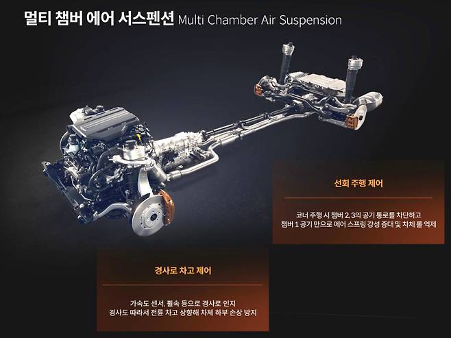 이중 멀티 챔버 에어 서스펜션은 기존 코일 스프링 대신 에어 스프링이 진동과 충격을 흡수하는 방식으로, 여러 개의 챔버(공기를 저장하는 공간)로 구성되어 주행 상황에 따라 서스펜션을 조절할 수 있다.