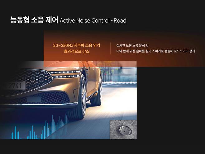 이와 함께 능동형 소음 제어 기술은 타이어 부근 4개의 가속도 센서와 실내 8개의 마이크를 통해 노면 소음을 측정하고 반대 위상의 소리를 발생시켜 20~250Hz 대역의 저주파 소음을 효과적으로 줄인다.