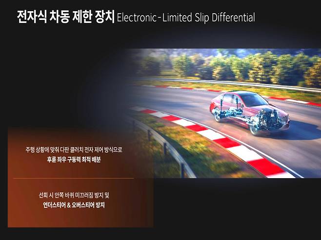 여기에 전자식 차동 제한 장치는 좌우 바퀴의 회전 차이를 능동적으로 조절하는 기술로, 노면 상태가 달라 한쪽 바퀴가 헛돌 때 회전수가 적은 바퀴에 동력을 전달해 주행 안정성과 탈출 성능을 높인다.
