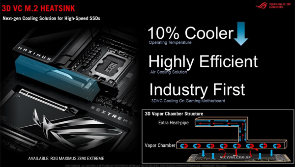 ROG MAXIMUS Z890 EXTREME 메인보드는 10G 이더넷이 포함된 듀얼 LAN과 썬더볼트5를 비롯해 풀컬러 슬라이딩 5인치 LCD 패널로 시스템 상태를 쉽게 모니터링하고 사용자 커스텀 이미지로 개성을 표현할 수 있다. 고성능 M.2 SSD를 위한 히트파이프가 추가된 3D 베이퍼 챔버 M.2 히트싱크도 달려있다.