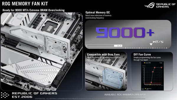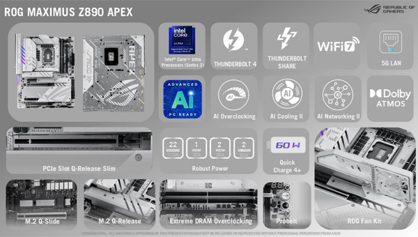 ROG MAXIMUS Z890 APEX는 게이밍 및 오버클럭 매니아들을 위해 설계된 고성능 메인보드로 화이트 컬러 디자인에 DDR5 메모리 온도를 낮추는 RGB 팬 킷, 5G 이더넷, 썬더볼트4 포트가 들어간다.