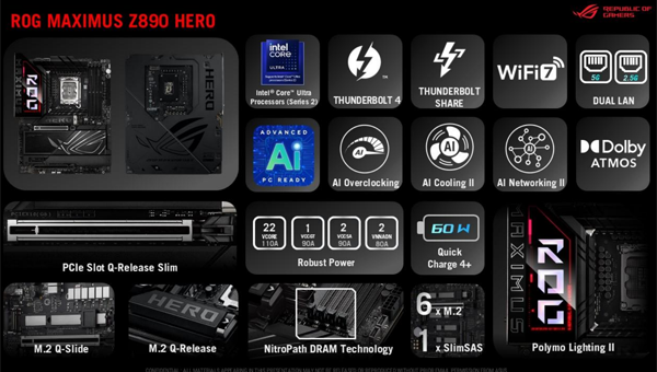 ROG MAXIMUS Z890 HERO는 가장 인기가 높은 ROG 메인보드로 안정적인 전원부로 오버클럭 성능을 극대화하며 5G 이더넷이 포함된 듀얼 LAN 기능 등을 갖췄다.
