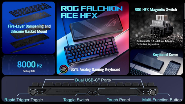 ROG FALCHION ACE HFX는 일반 풀사이즈 게이밍 키보드 레이아웃에 비해 65% 밖에 되지 않는 크기에 다양한 부가 기능을 갖춘 제품으로, 듀얼 USB-C 포트와 토글 스위치 및 터치 패널, 멀티 펑션 버튼과 트리거 토글 스위치로 직관적인 기능 조작이 가능하다. ROG HFX 마그네틱 스위치와 5 레이어 댐핑 실리콘 개스킷 마운트, 스피드 탭 모드 지원 등을 포함한다.
