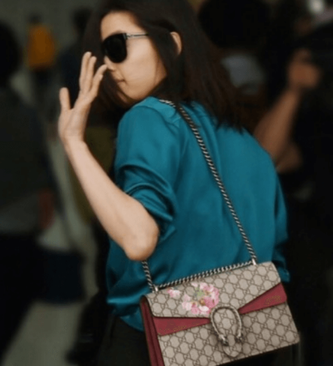 구찌의 상징 그 자체였던 디오니소스 백으로 카리스마 넘치는 룩에 포인트를 주었다. 이때도 생얼에 선글라스를 착용하여 자연스럽지만 카리스마가 느껴지는 무드 연출
