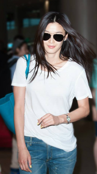 화이트 티셔츠에 데님만 입고 레전드 찍어버린 전지현. 블루 컬러의 구찌 숄더백으로 시원하고 청량하게 코디했는데 생얼에 보잉 선글라스를 착용하여 자연스럽고 멋스러운 룩을 완성했다.