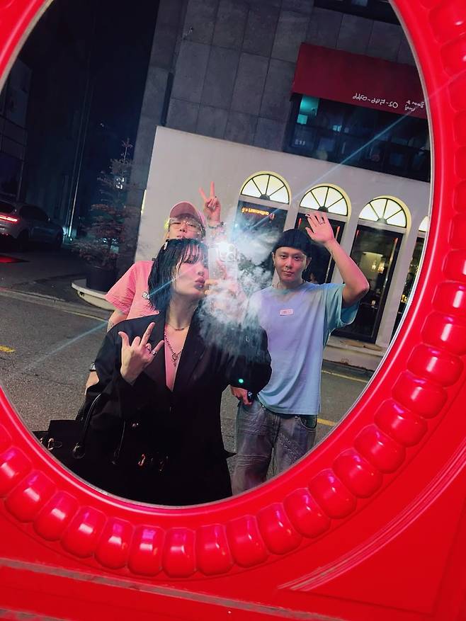 또 다른 거울 셀카에서는 남편 용준형과 지인이 함께한 유쾌한 순간을 담아냈다.