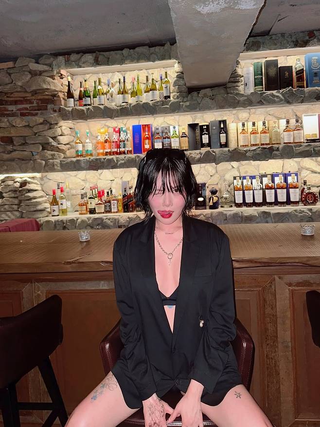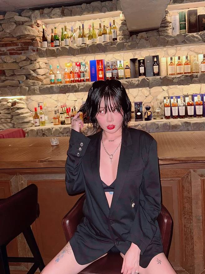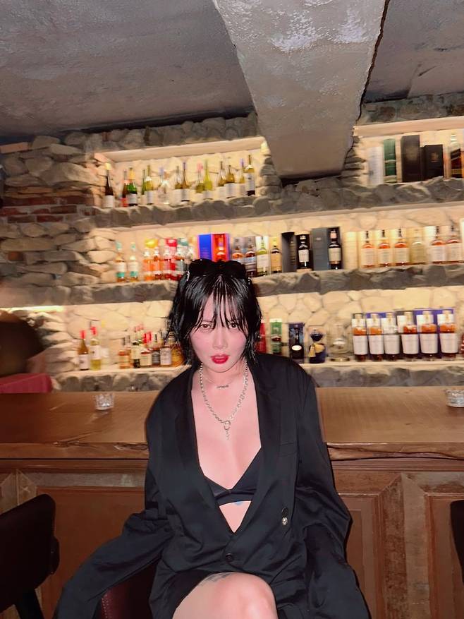 공개된 사진 속 현아의 모습은 '파격' 그 자체다. 블랙 오버사이즈 재킷을 마치 원피스처럼 걸쳤는데, 그 안에는 브라톱을 과감하게 노출해 아찔함을 더했다.