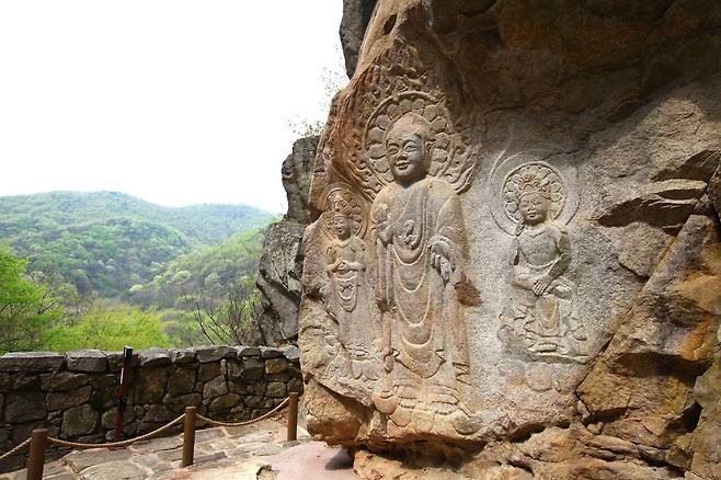백제 후기인 7세기에 새겨진 불상, 마애여래삼존상입니다. 마애여래삼존상은 백제 미술의 진수를 엿볼 수 있는 예술 작품으로, 본존인 석가여래입상을 중심으로, 오른쪽에는 가부좌를 틀고 있는 미륵반가사유상, 왼쪽에는 제화갈라보살입상이 정교하게 조각되어 있습니다.