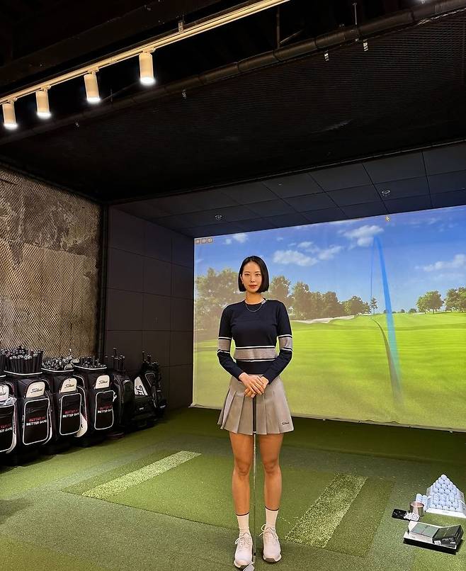 무엇보다 눈에 띄는 건 그녀의 컬러 밸런스 감각이다. 네이비와 그레이의 절제된 조합 위에 화이트 양말과 골프화를 더해 전체적인 톤을 깨끗하게 정리했다. 여기에 짧은 단발 헤어스타일과 심플한 액세서리로 미니멀한 감성을 살려, 스크린골프장에서도 감각적인 스타일을 완성했다.
