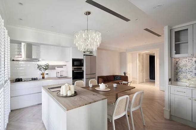 특히 주목할 만한 점은 자개로 만들어진 샹들리에로, 햇빛을 반사해 다채로운 빛을 은은하게 발산하며 보헤미안 스타일의 엣지를 강조한다. 조리대 뒤편의 수제 유약 타일은 공간에 따뜻함을 더한다.