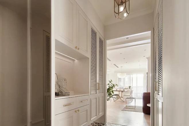 전면 수납장은 선반을 감추듯 디자인되어 있으며, 클래식한 라인으로 정돈된 느낌을 준다. 메탈 조명과 화이트 우드 마감이 조화를 이루어 입구부터 세련된 분위기를 연출한다.