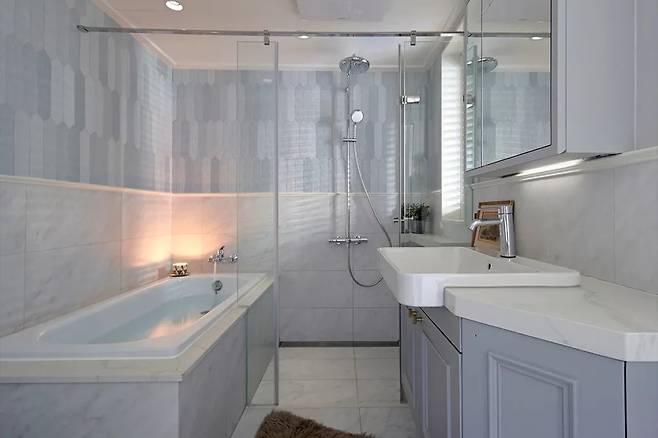 자연광이 부족한 욕실은 작은 창과 직사각형 헥사 타일로 밝은 분위기를 조성한다. 연보라색과 회색 타일이 자연석 질감과 잘 어우러져 아늑하면서도 클래식한 느낌을 주며, 습식과 건식 공간이 명확히 구분되어 있다.