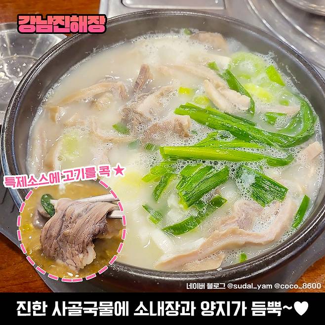 메인 메뉴는 양선지 해장국이지만 성시경 PICK은 내장탕! 진한 사골국물에 소 내장과 양지고기 듬뿍 들어가 있어서 숟가락으로 몇 번 휘적이기만 해도 부속 고기들이 듬뿍 들어가 있는