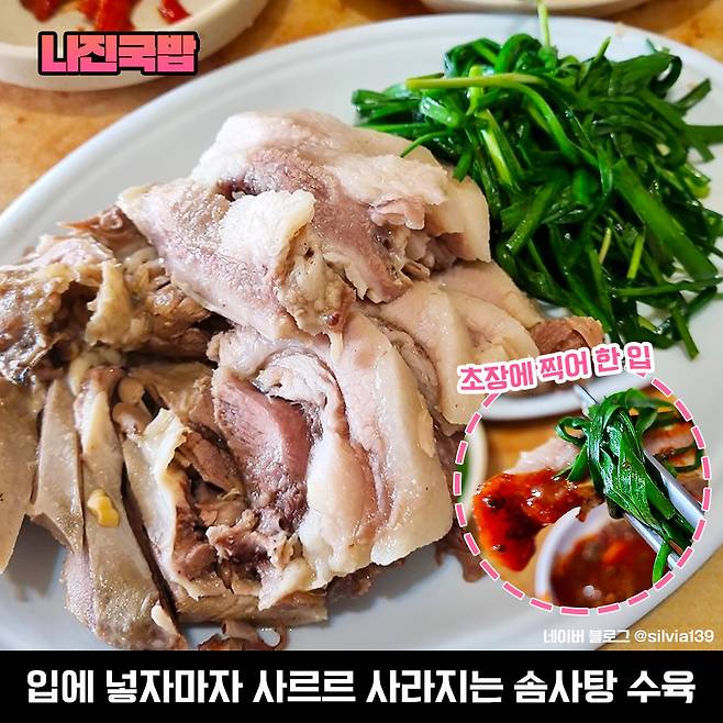 나진국밥에서 국밥만큼 유명한 메뉴는 바로 수육이에요. 입에 들어가기만 하면 사르르 녹는 솜사탕 같은 식감에 살짝 데쳐진 부추를 곁들여서 초장 콕콕 찍어 먹다 보면 한 접시는 뚝딱이랍니다!