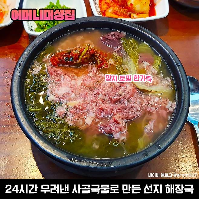 어머니 대성집의 시그니처메뉴는 24시간 우려낸 사골국물로 만든 선지해장국이에요. 캔 참치 같은 비주얼의 부드러운 양지가 잘게 찢어져 토핑이 되어 있어서 조금 생소한 비주얼이기는 하지만, 우거지와 선지, 콩나물이 가득 들어있는 시원한 국밥이랍니다.