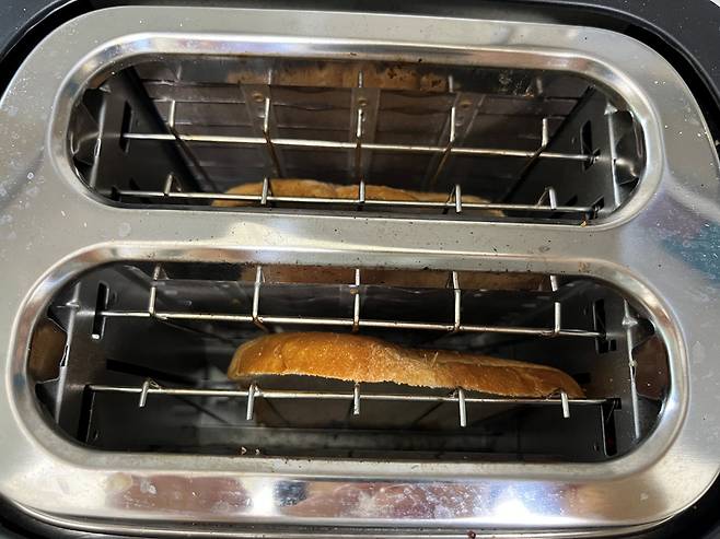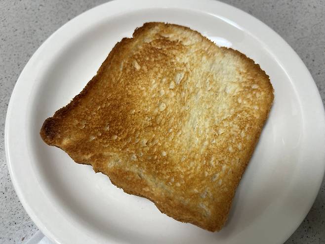 식빵을 토스트기 또는 팬을 사용해서 바싹 구워주세요. 수분이 거의 남지 않을 정도로 바싹 구워 주세요. 겉면이 노릇한 정도가 아니라, 만졌을 때 딱딱하고 잘 부서질 만큼 말려주는 것이 중요합니다.