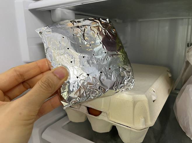 여기 이쑤시개로 구멍을 몇 개 뚫어 주세요. 호일 겉면에 작은 구멍을 3~5개 정도 내주면, 냄새가 안쪽의 식빵으로 더 잘 들어가 흡착 효과가 높아집니다.