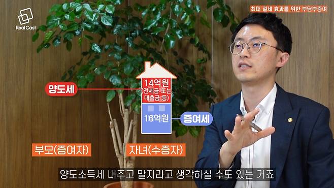 예를 들어 30억원의 부동산을 증여할 경우 14억원의 채무 또는 전세권설정 등이 있다면 이 채무를 승계하는 조건으로 14억원에 대해서는 부모(증여자)가 양도세를 나머지 16억원에 대해서는 자녀(수증자)가 증여세를 내는 겁니다. 그러면 자녀가 자금이 많이 없을 수 있기 때문에 30억원을 증여세를 혼자 내는 것보다는 16억원에 대해서 증여세를 내는 게 증여세를 좀 낮출 수 있는 효과가 있는 겁니다. 부모 입장에서는 만약에 1세대 1주택 비과세를 적용 받을 경우 14억원에 대한 양도세를 안 낼 수도 있습니다.