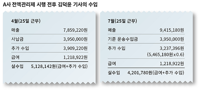 전액관리제 시행 이후 김덕윤씨가 일하는 A사의 월급 지급 방식은 이렇다. 우선 매출액 전부를 회사가 가져간다. 이후 기사에게 고정급여와 성과수당을 준다. 여기서 각종 세금·보험료를 공제한다. 고정급여 액수는 전액관리제 시행 이전과 같다. 성과수당은 ‘운송수입금 기준액’을 토대로 계산한다. 이 기준액은 일 15만8000원으로, 전액관리제 시행 전 사납금 액수와 같다. 이전에는 매출에서 사납금을 뺀 금액을 기사가 모두 가져갔는데, 전액관리제 시행 이후에는 60%만 기사 몫이다. 40%는 회사가 가져간다. A사 기사들에게 ‘사납금 폐지’란, 납부 부담이 사라졌다는 의미와는 거리가 멀다. ‘사납금 외의 나머지’를 전부 가져갈 수 없다는 게 더 뼈아프다. A사의 한 기사는 전액관리제가 “죽어라 일해서 번 내 돈 40%를 빼앗아가는 이상한 제도”라고 말했다.
