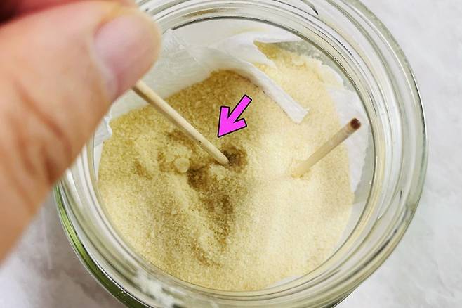 여기에 이쑤시개를 몇 개 꽂아주세요. 그러면 효과는 더 좋은데요. 이쑤시개가 습기를 흡수해서 뽀쏭함을 유지하게 도와줍니다.